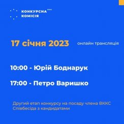 Сьогодні, 17 січня 2023 року, Конкурсна комісія з добору кандидатів на посаду члена Вищої кваліфікаційної комісії суддів України у другий день співбесід заслухає наступних кандидатів:
