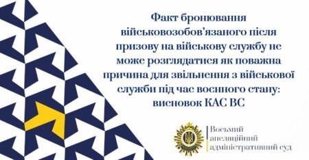 За результатами касаційного перегляду справи № 260/1851/22 колегія суддів Касаційного адміністративного суду у складі Верховного Суду (далі – КАС ВС) погодилася з висновком Восьмого ААС, що факт бронювання військовозобов`язаної особи після її призову на військову службу не може розглядатися як поважна причина для її звільнення з військової служби під час воєнного стану на підставі підпункту «г» пункту 2 частини четвертої статті 26 Закону України «Про військовий обов`язок і військову службу»