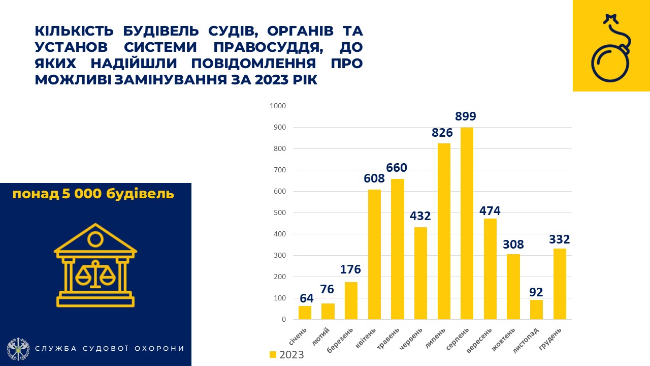Громадянам повідомлялося про заборону пронесення до приміщень судів, органів та установ системи правосуддя речей підвищеної небезпеки, а вилучені предмети на період перебування в судових установах зберігалися у спеціальних камерах схову. 9 порушників законів передано до Національної поліції України. Служба вкотре наголошує на відповідальності та наслідках у разі спроби пронесення заборонених предметів до судових установ! *** ЗАМІНУВАННЯ Служба судової охорони повідомляє, що впродовж 2023 року кількість повідомлень про можливі замінування об'єктів судової гілки влади збільшилася. Зазначається, що загалом надійшло понад 3 500 повідомлень про можливі замінування понад 5 000 будівель судів, органів та установ системи правосуддя. Проте в жодному з випадків інформація не підтвердилася.