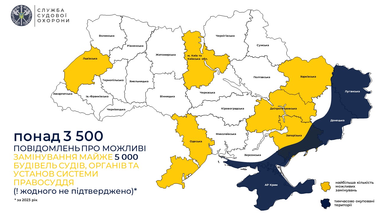При цьому зазначимо, що останнім часом в Україні значно зросла кількість повідомлень про замінування установ системи правосуддя, чинниками яких є військова агресія росії. Зокрема, псевдомінування можуть використовуватися для впливу на судову систему або відволікати увагу правоохоронних органів. Певні групи або особи можуть мінувати судові установи для вираження свого незадоволення політичними рішеннями чи для впливу на судові процеси. Групи, що прагнуть поширювати страх або впливати на суспільство, можуть вибрати мінування судових установ як засіб впливу. Особи, які вважають, що їхні інтереси були порушені внаслідок судового рішення, можуть вдаватися до мінування установ як засобу вираження своєї обуреності чи мстивості. Боротьба з мінуванням судових установ вимагає комплексного підходу, що включає поліцейські заходи безпеки, розслідування та правові дії для притягнення винних до відповідальності. Служба співпрацює з правоохоронними органами для реагування на можливі загрози та забезпечення відповідної реакції на них. Служба судової охорони відповідає за забезпечення безпеки судових установ та гарантує, що будь-які можливі загрози, як-от повідомлення про замінування, не стануть реальною загрозою для судових процедур та учасників судового процесу. Діяльність Служби судової охорони є важливою для забезпечення незалежності та ефективності судових процесів, а також підтримки принципу верховенства права. В інфографіці вказано, де найбільша кількість повідомлень надійшла з регіонів, наближених до лінії зіткнення (Дніпропетровська, Запорізька та Харківська області), а також у місті Києві та області, Одеській та Львівській областях.