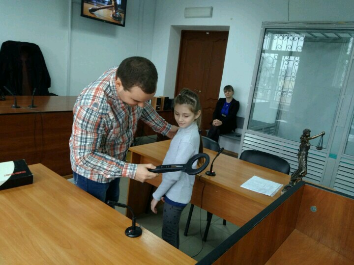• судовий розпорядник Богдан Шкрумада розповів дітям про притаманні судовій системі атрибути. Так символами судової влади є державні символи України – Державний Герб і державний Прапор України, а правосуддя в суді здійснюється суддями в мантії та з нагрудним знаком. Навіть продемонстрував як працює справжній ручний металодетектор;