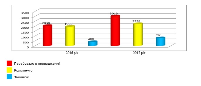 Загальна кількість справ та позовних заяв, що знаходились в провадженні суду, з урахуванням залишків справ (на 01.01.17р. становить 400), становить 3019.Загальна кількість розглянутих справ та позовних заяв, що знаходились на розгляді в суді 2228 , або 73,8%. Залишок нерозглянутих справ та позовних заяв станом на 01.01.18 року – 791, або 26,2% від загальної кількості справ та позовних заяв, що перебували в провадженні суду впродовж року.