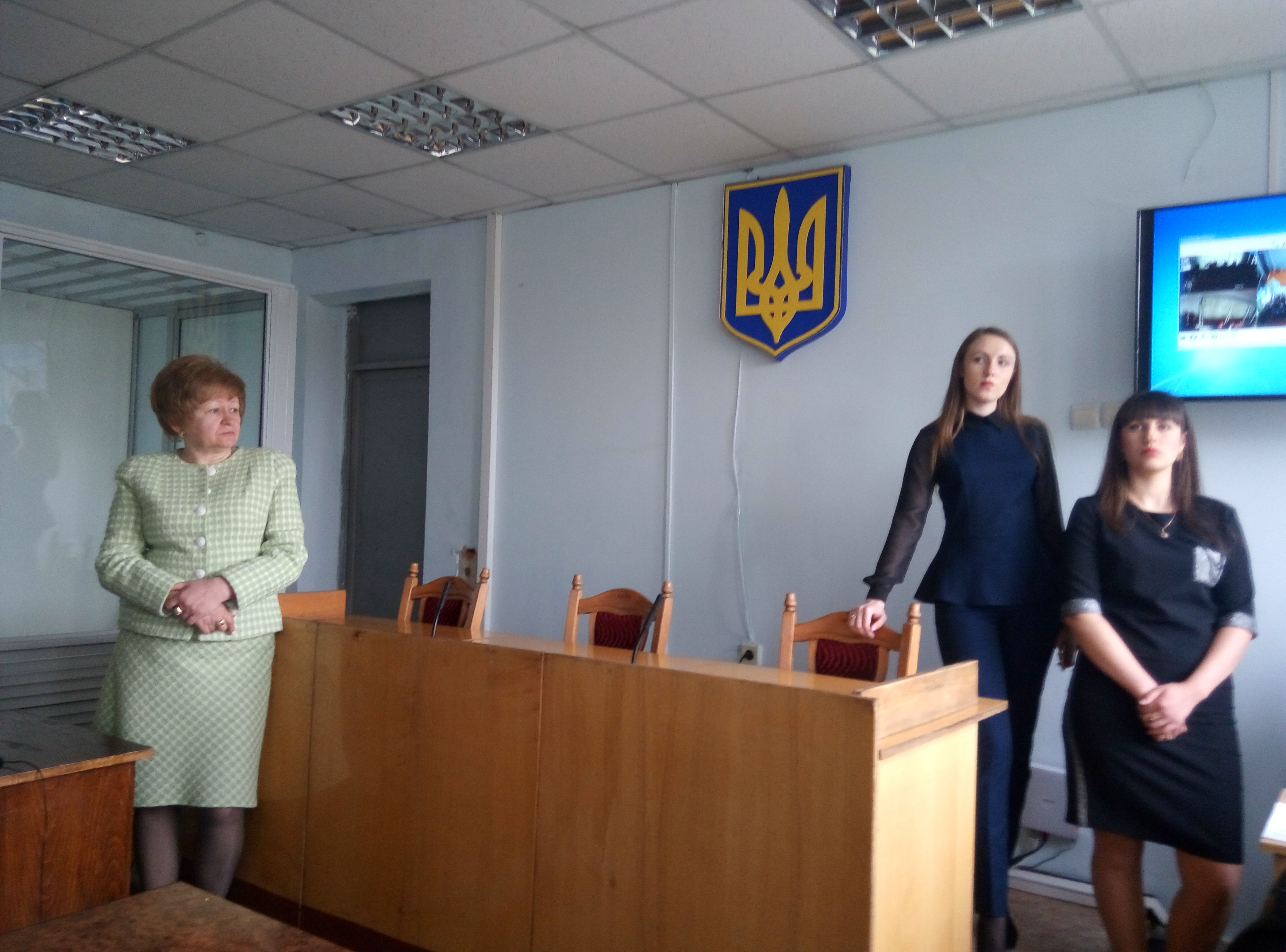 Коли всі студенти розмістилися у залі, Тетяна Яківна розповіла про те, як розподіляються справи між суддями, у якому вигляді надходять до суду та які умови висуваються до сучасного обладнання залу засідань. З порядком роботи у комп’ютерній програмі Д-3, порядком реєстрації справ різних категорій, ознайомив провідний спеціаліст з інформаційних технологій Беженуца О.І. Також, було оглянуто веб-сайт суду, продемонстровано судове засідання у режимі відеоконференцзв’язку. Секретар судового засідання Лянгорт З.О. розповіла студентам про засоби фіксування судового процесу.
