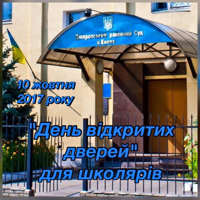 Сьогодні, 10 жовтня 2017 року, Дніпровський районний суд м.Києва "відчиняє свої двері" школярам середнього шкільного віку, щоб познайомити їх з роботою суддів, інших юридичних професій та правилами поведінки в суді. Захід планується дуже цікавим і насиченим. До участі у ньому запрошені судді, прокурори та адвокати. Подробиці та враження вже незабаром.
